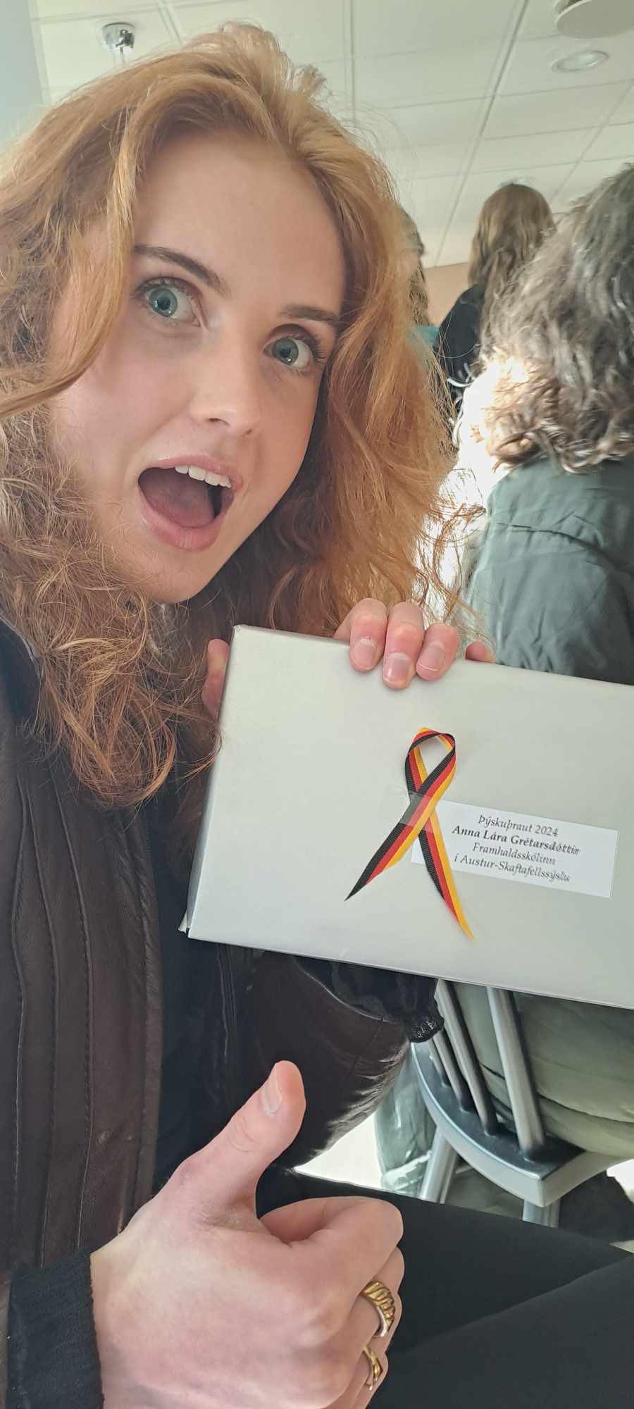 Laugardaginn 16. mars stóð Félag þýzkukennara fyrir verðlaunahátíð fyrir bæði Þýskuþrautina og stuttmyndasamkeppnina. Þar mætti Anna Lára og tók á móti viðurkenningu fyrir frammistöðuna og hitti aðra verðlaunahafa. Við óskum Önnu Láru hjartanlega til hamingju og hlökkum til að heyra af ferðalaginu í sumar.