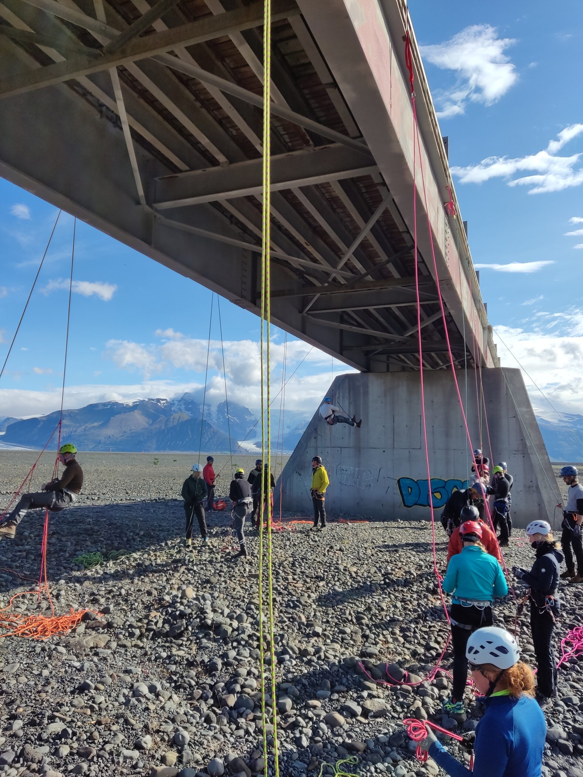 Á næst síðasta degi áfangans settu nemendur upp sín eigin akkeri og sigu af þeim fram af hömrunum í Miðskjóli á Hnappavöllum. Áfanganum lauk með línuklifri á Skeiðarárbrú en hún er hinn fullkomni staður til að æfa línuklifur. Áður en nemendurnir héldu til síns heima buðum við þeim að prófa klifurveginn í Káraskjóli í Freysnesi við góðar undirtektir.