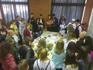 Á myndinni eru Ástrós Aníta, Hafsteinn, Ragnar og Bjarmi við veisluborð sem útbúið var með mat frá löndunum fimm og að sjálfsögðu buðu Íslendingarnir upp á harðfisk.