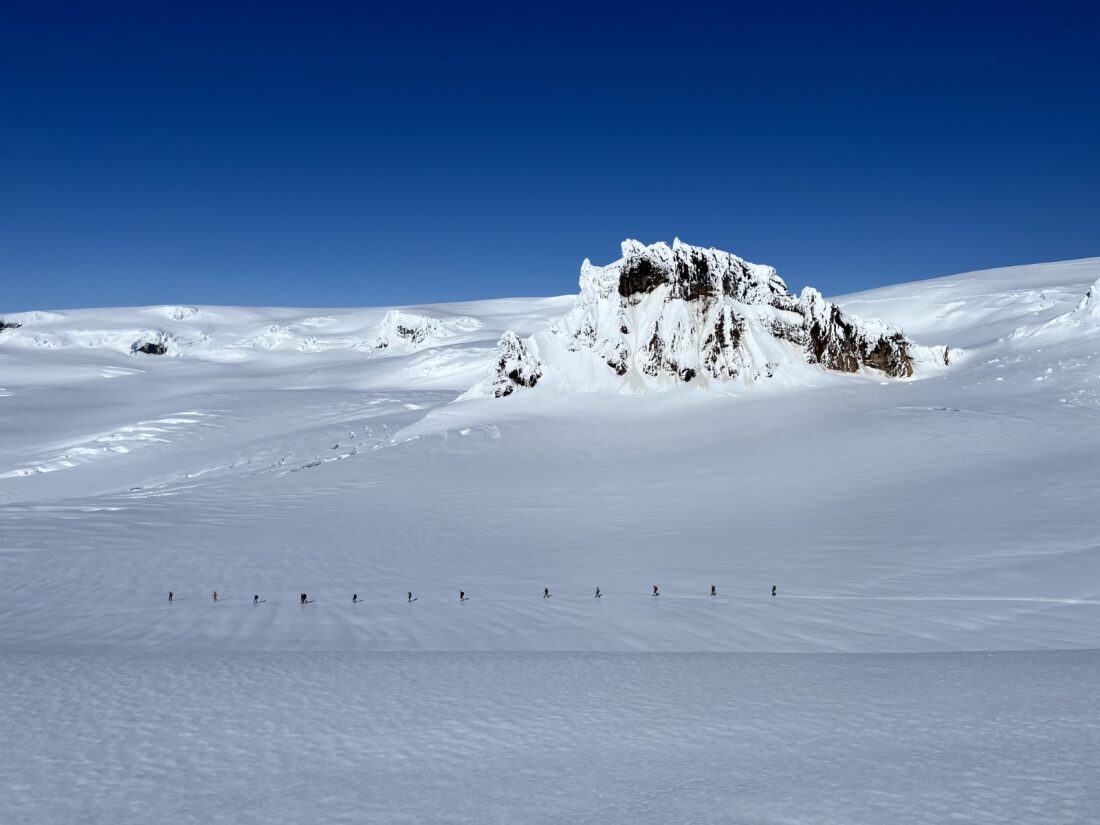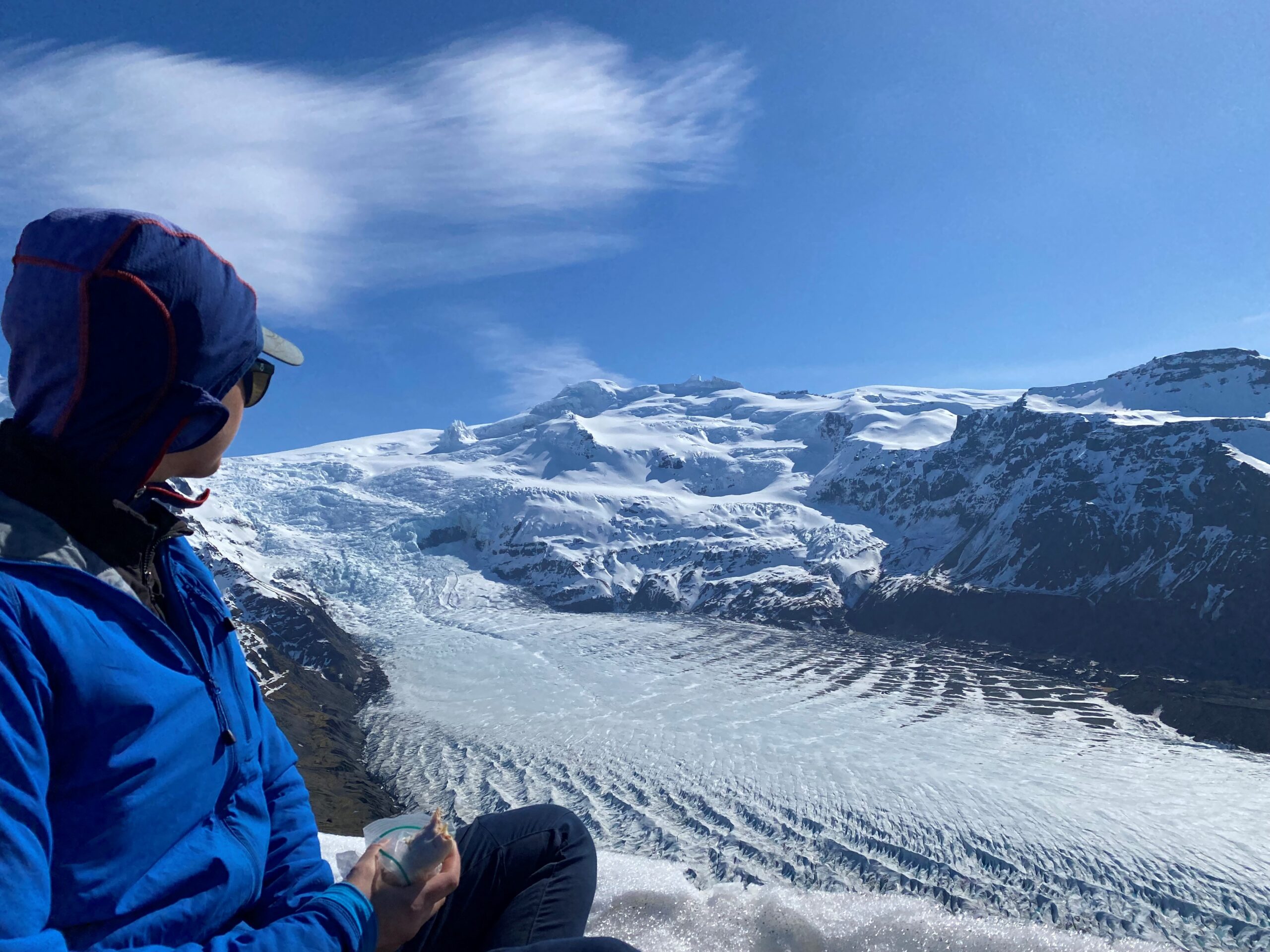Síðasta daginn gekk hópurinn niður Virkisjökulsleiðina í mikilli sól og hita. Við vorum ánægð að komast til byggða eftir fjóra langa en góða daga á jöklinum. Heilt yfir var ferðin ógleymanleg og heilmikið ævintýri sem bæði reyndi á líkamlegt og andlegt þol. Hópurinn stóð sig með stakri prýði og styrktist enn meira og þéttist við þessa áskorun.