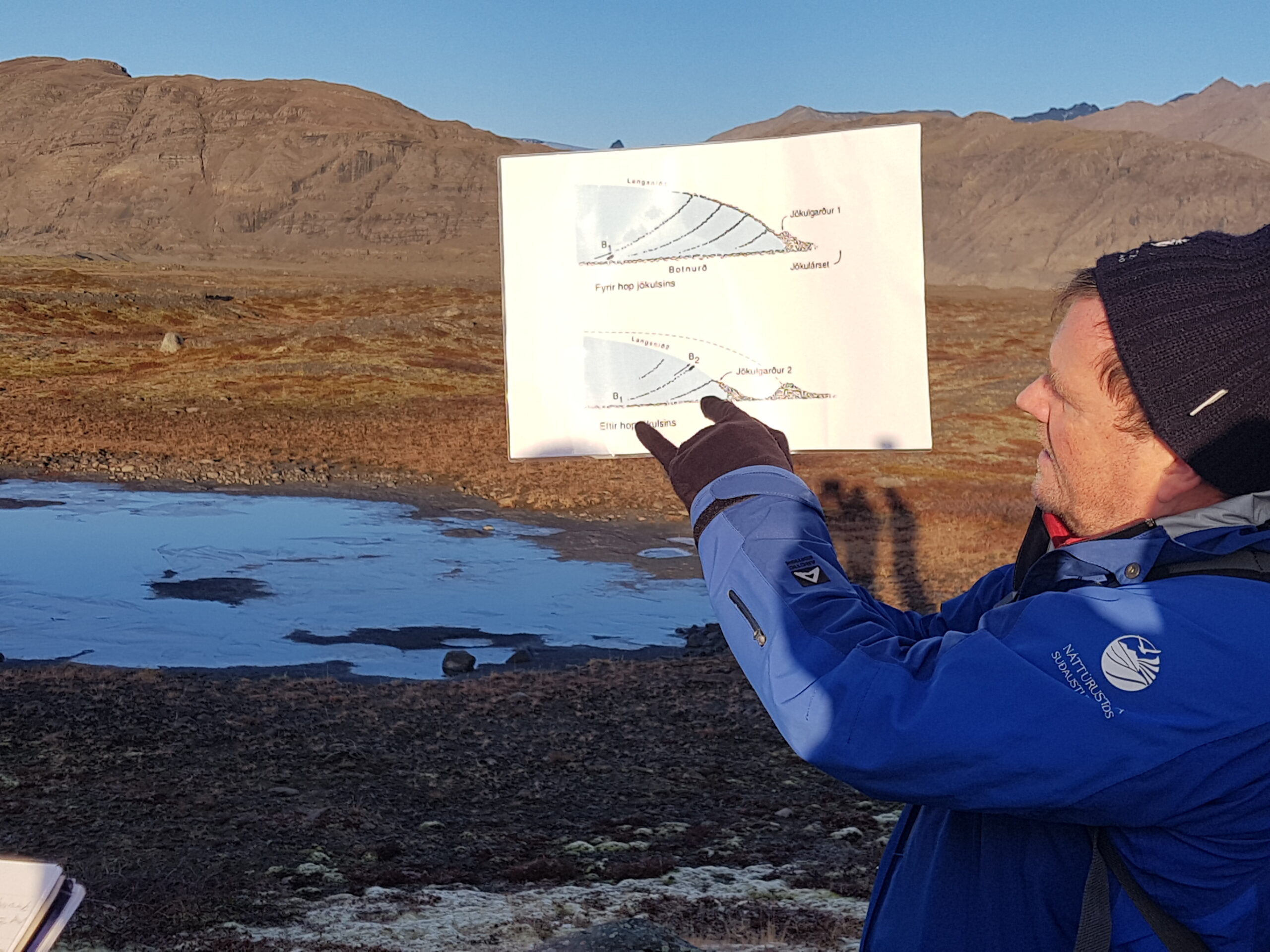 Veðrið skartaði sínu fegursta, hiti var rétt yfir frostmarki, logn og heiðríkja. Líkt og undanfarin ár hefur verið gengið frá brúnni þar sem Heinabergsvötn áður runnu og þaðan yfir jökulöldurnar að lóninu fyrir framan Heinabergsjökul. Gönguferðin endar svo á bílastæðinu við Heinabergsjökul. Á leiðinni er oft staldrað við og ýmis jarðfræðileg fyrirbrigði skoðuð. Inni við Heinabergslón var notaður fjarlægðarkíkir til að sjá hversu langt er í stóra jakann sem var áður hluti af jöklinum.
