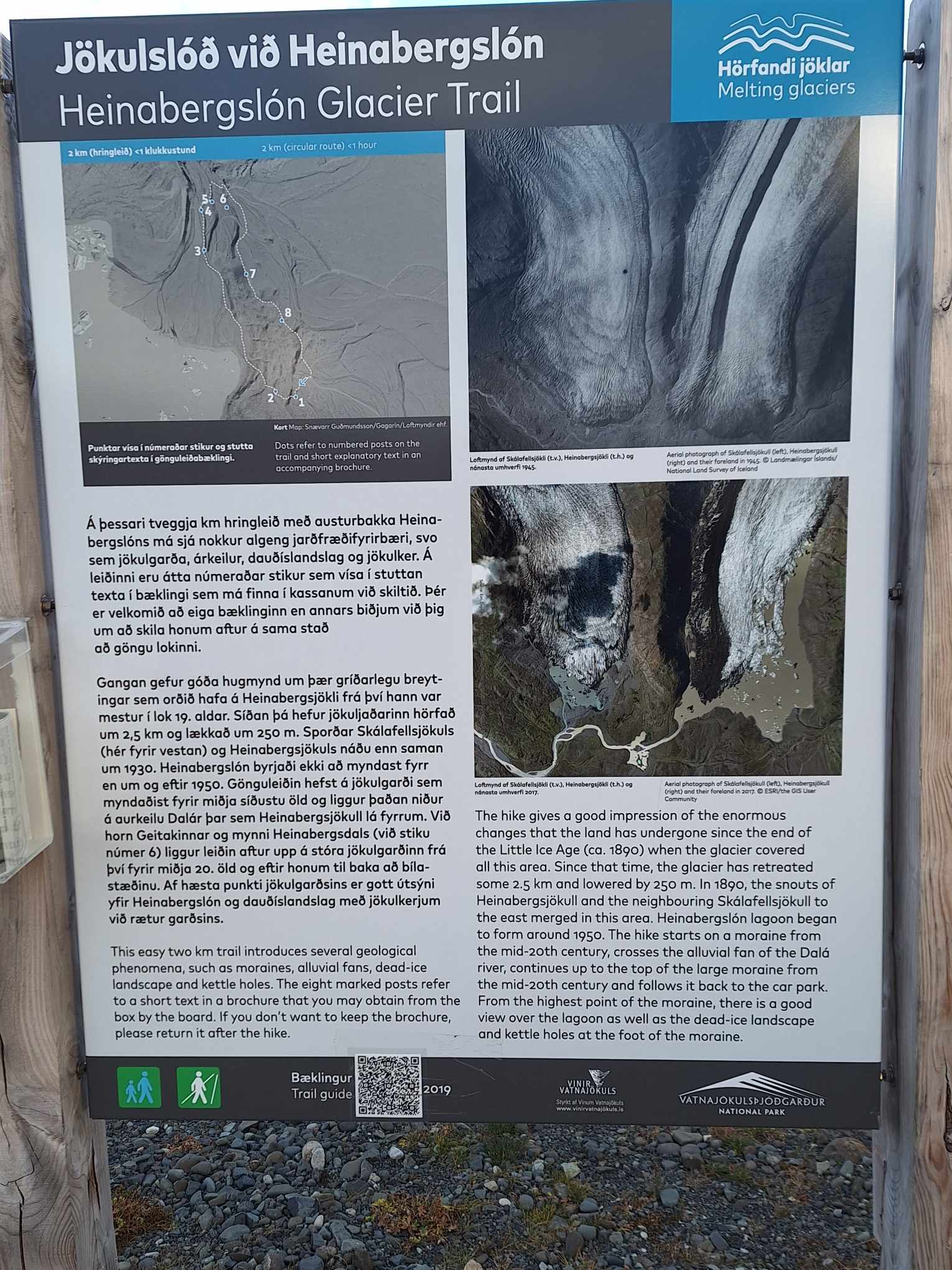 Ferðin í dag hófst við brúna yfir Heinabergsvötn. Það eru alltaf nokkrir í hópnum sem hafa ekki farið á þetta svæði og vita því ekki af þessari brú eða að þarna hafi þjóðvegurinn legið eitt sinn. Frá brúnni er síðan gengið inn að lóninu fyrir framan Heinabergsjökul. Á leiðinni er staldrað alloft við og lesið í landið. Í ferðinni í dag vorum við t.d. að skoða árfarvegi, jökulruðninga, jökulkembu, landmótun jökla uppi í fjöllum, gróðurframvindu, veðrun og mismunandi grjót og hversu vel eða illa það veðrast. Frá lóninu lá síðan leiðin fram hjá gömlu mælingarpunktunum og á bílaplanið fyrir framan Heinabergslónið þar sem rútan beið eftir okkur. Ferðin í dag gekk ljómandi vel og gera má ráð fyrir að allir hafi komið heim reynslunni ríkari.