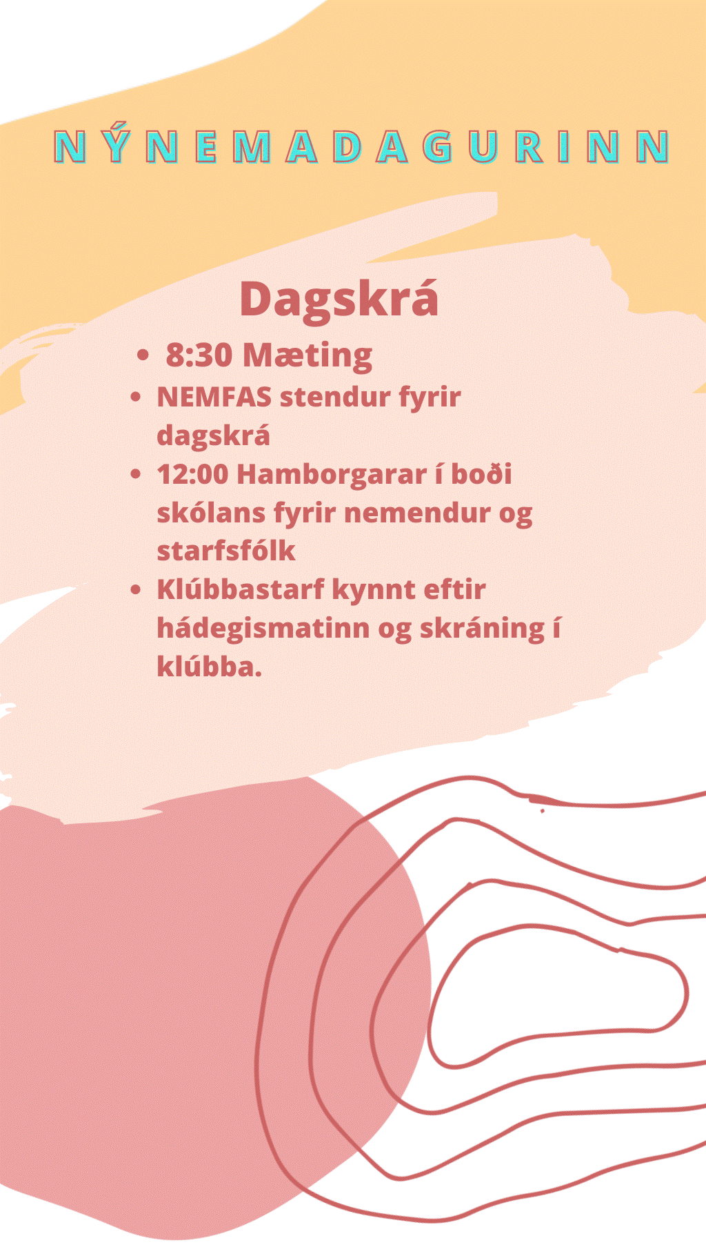 Á morgun, miðvikudaginn 30. ágúst verður dagurinn helgaður nýnemum. Það er ekki hefðbundin kennsla en allir eiga að mæta í skólann klukkan 8:30. Það er nemendafélag skólans sem hefur skipulagt dagskrá fyrir daginn. Í hádeginu býður skólinn til hamborgaraveislu fyrir nemendur og starfsfólk.
