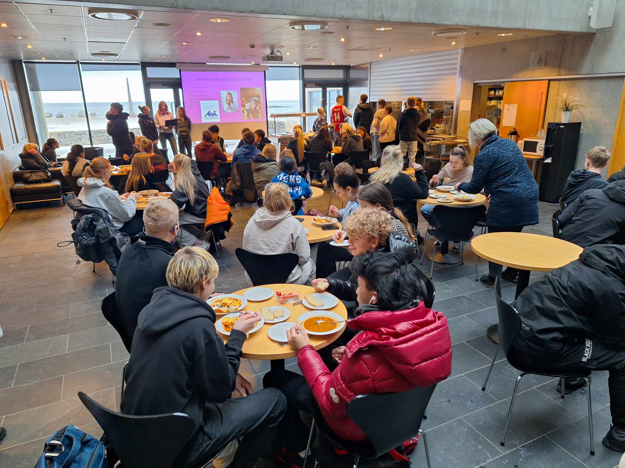 Í dag fengum við góða gesti í heimsókn en það voru nemendur í 10. bekk grunnskólans. Þeir voru hingað komnir til að kynna sér skólann enda orðið stutt eftir af grunnskólagöngunni og kominn tími til að athuga næstu skref í leik og starfi. Krökkunum var boðið í súpu og nýbakað brauð og var nemendum FAS og kennarahópnum einnig boðið í mat. Á meðan á snæðingi stóð kynntu forsvarsmenn nemendafélagsins félagslífið í skólanum.